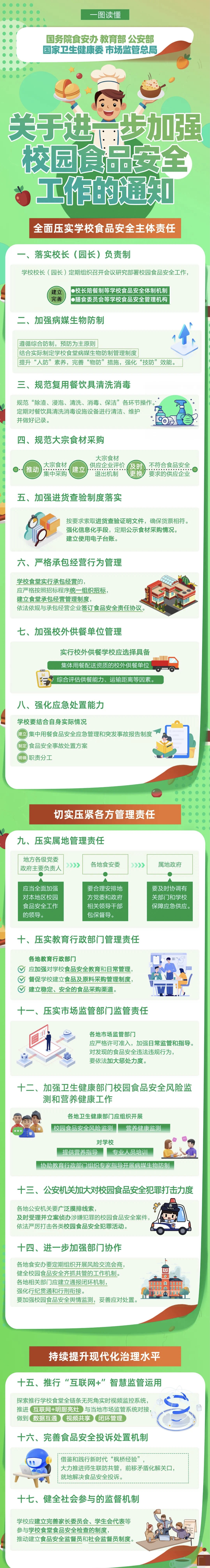 近日,国务院食安办联合教育部、公安部、国家卫生健康委、市场监管总局印发《关于进一步加强校园食品安全工作的通知》(以下简称《通知》),聚焦校园食品安全主体责任、管理责任和现代化治理水平,部署各地进一步健全校园食品安全全链条防控风险的制度机制,强化校园食品安全保障。
